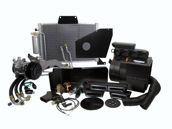 Complete air conditioning, head, and defrost system. Fits trucks that came from the factory without A/C. These kits are constructed to mount to existing holes in your dash and firewall without fabrication. Kits include evaporator, compressor, drier, all mounting brackets, hardware, louvers, duct hose, pre-formed aluminum lines, hi/lo safety switch, wiring harness, and installation instructions.