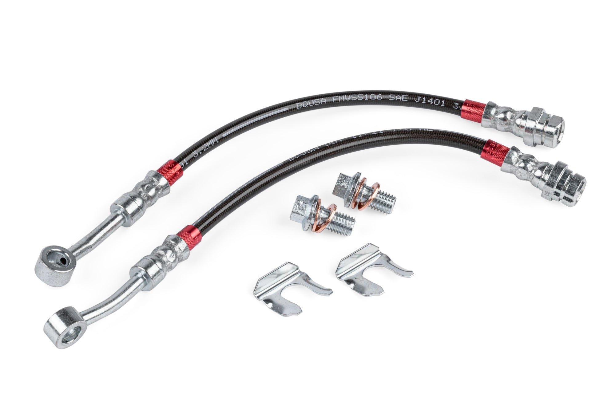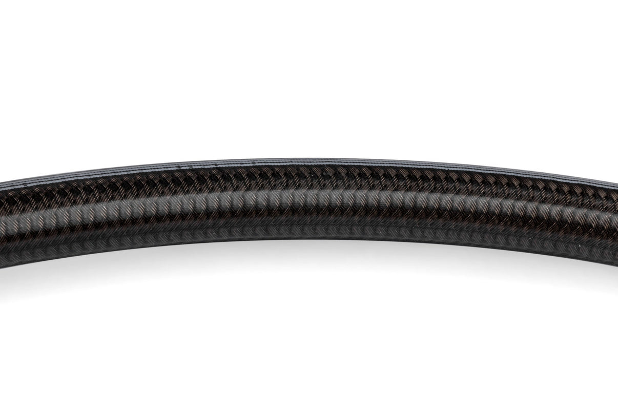 APR Braided Stainless Steel Direct-Fit Brake Line Upgrades are a direct replacement that improves your braking experience with the best lines on the market today. We do away with the factory rubber hoses that expand and can even rupture over time, and replace them with braided 304 stainless steel lines with a smooth-bore Polytetrafluoroethylene (PTFE) / Teflon core that allow for very little expansion. This gives you a firmer brake pedal with less required pedal travel as the fluid gets to its destination faster without all the flex and expansion that happens with lower quality lines. Unlike many universal lines on the market that often use connector adapters, ours are application specific with the correct length and hose fittings, eliminating potential leak points. The lines have an attractive polyvinyl chloride (PVC) outer jacket in smoked clear so you can see the braided lines from within, with red anodized inserts, and Cr3+ steel connectors. Each brake line is fully tested to 3,000 psi prior to sale, which is far beyond typical operating pressures. The lines are independently certified as SAE "low-expansion" lines and average only 0.07 cc/ft @ 1,000 psi and 0.11 cc/ft at 2,900 psi! They are compatible with DOT 3, 4, 5 (silicone-based), and 5.1 brake fluids, are fully DOT-compliant, and meet FMVSS106 and SAE J1401 standards. These are the only brake lines you'll ever need!