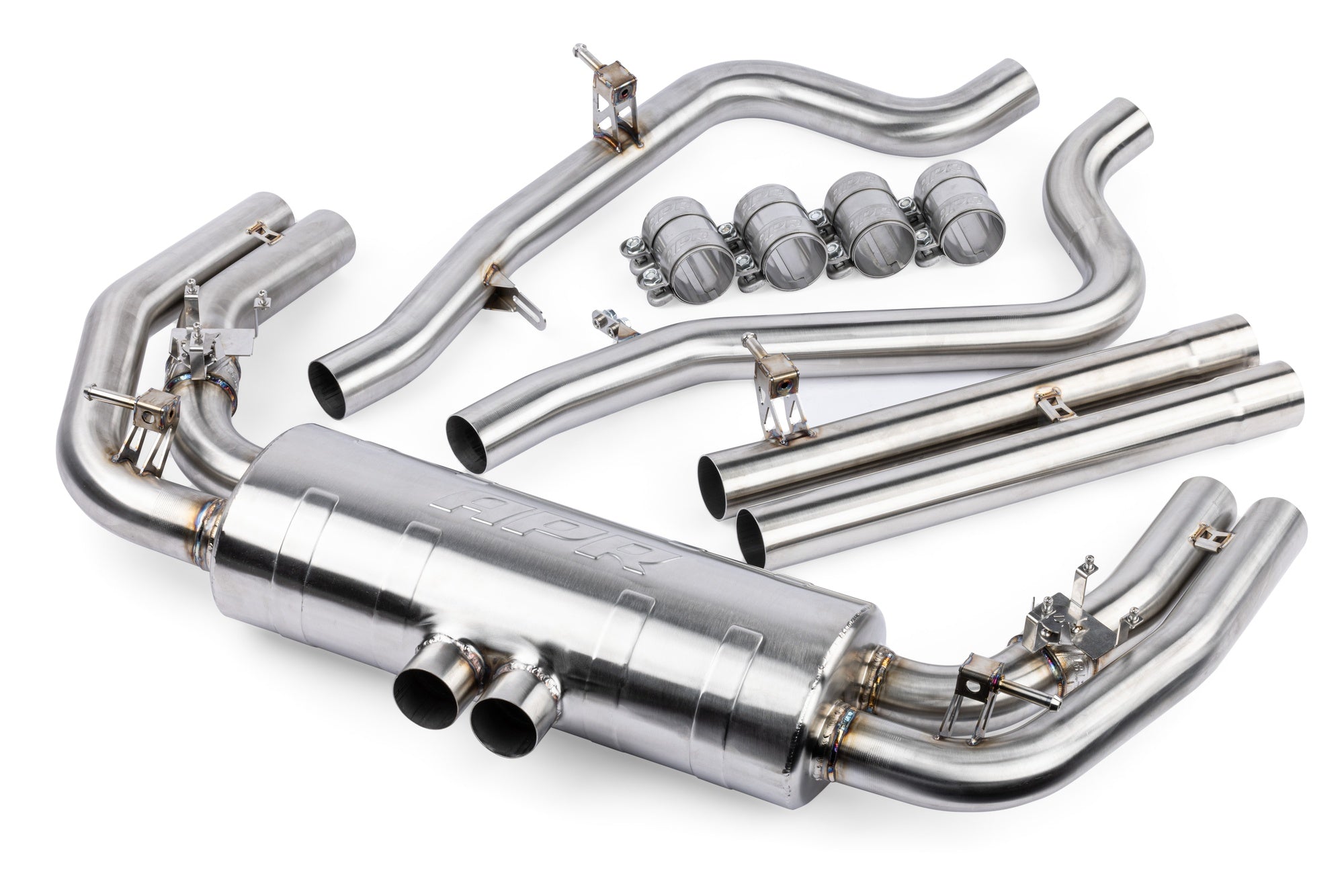 The APR Catback Exhaust System personalizes your vehicle's looks, sound and performance. Beautifully hand-crafted T304-stainless-steel components adorn the system with stunning TIG-welding throughout. Our straight-through brushed-finished mufflers smooth the exhaust note to a deep growl, without adding restrictions or rasp. Strong high-quality bracketry and OEM-style clamps hold the system steadily in place, making the install or removal a snap, and fitment simple, yet precise. Dual 2.5" mandrel-bent exhaust paths provide an ultra-smooth path, steadily feeding exhaust gasses out of the quad exit system, while looking tidy from under the rear bumper. Our cast valve housings enable the vehicle to be fitted with the factory electronic valve actuators, retaining OEM valve operation for variable sound levels. Finally, our quad exit exhaust tubes exit the system into the beautiful factory RS bumper integrated exhaust tips