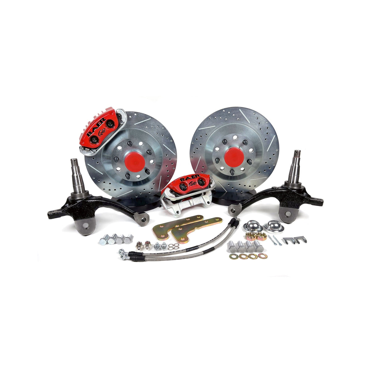 This system features the "Original" Baer 2-piston, pad guided caliper (PGC) mounted to a 13", 1-piece slot, drill, zinc plated integral hub rotor. The PGC caliper comes in a red powder coated finish with a black logo, includes dust/weather seal's and uses the popular D412 pad type. The system includes spindles (not installed), premium bearings with races pre-installed, dust caps, mounting brackets, stainless braided hoses and all necessary hardware making for an easy assembly. The 13" "Classic" system fits most 17" or larger wheels.
