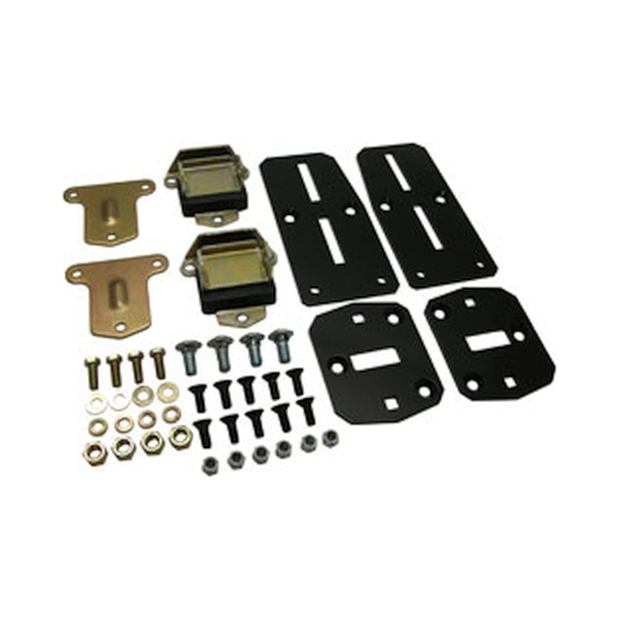 Brothers LS engine mount adapter kit is the answer to popular LS engine swaps where the mounts don't line up with the proper frame location. This kit allows almost 3-inches of adjustment of the engine. These adapter plates fit most applications and make installing your LS engine much less of a hassle. Many adapter plates do not allow the transmission to line up with the transmission cross member. This improved design with no-weld brackets are CNC laser cut 1018 steel and features a durable black powder coat finish. Adapter plates are made of 1018 steel and include the correct hardware to complete the installation. Allows the engine to move from 1/2 inch rearward (great for oil pan to crossmember clearance) up to 2-1/2 inches forward allowing for a completely custom range of positions. Allows early three bolt type poly urethane motor mounts (included) to fit LS engines. Early type small block short and wide mount Includes Hi-Performance interlocked Poly Urethane Mounts and hardware.