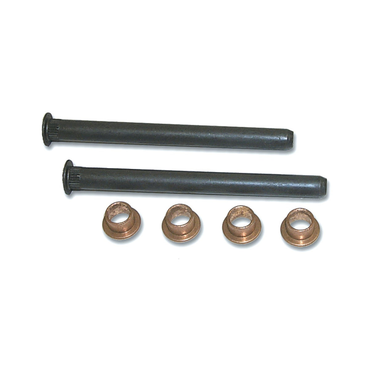 This set is complete with all necessary hardware to repair and restore your door hinges to their original function. New pins and bushing will take the free play out of your hinges and make them operate like factory again. Fresh hinges make aligning sagging doors simple. NOTE: Set includes two pivot pins and four bronze bushings. 2 sets required per truck.