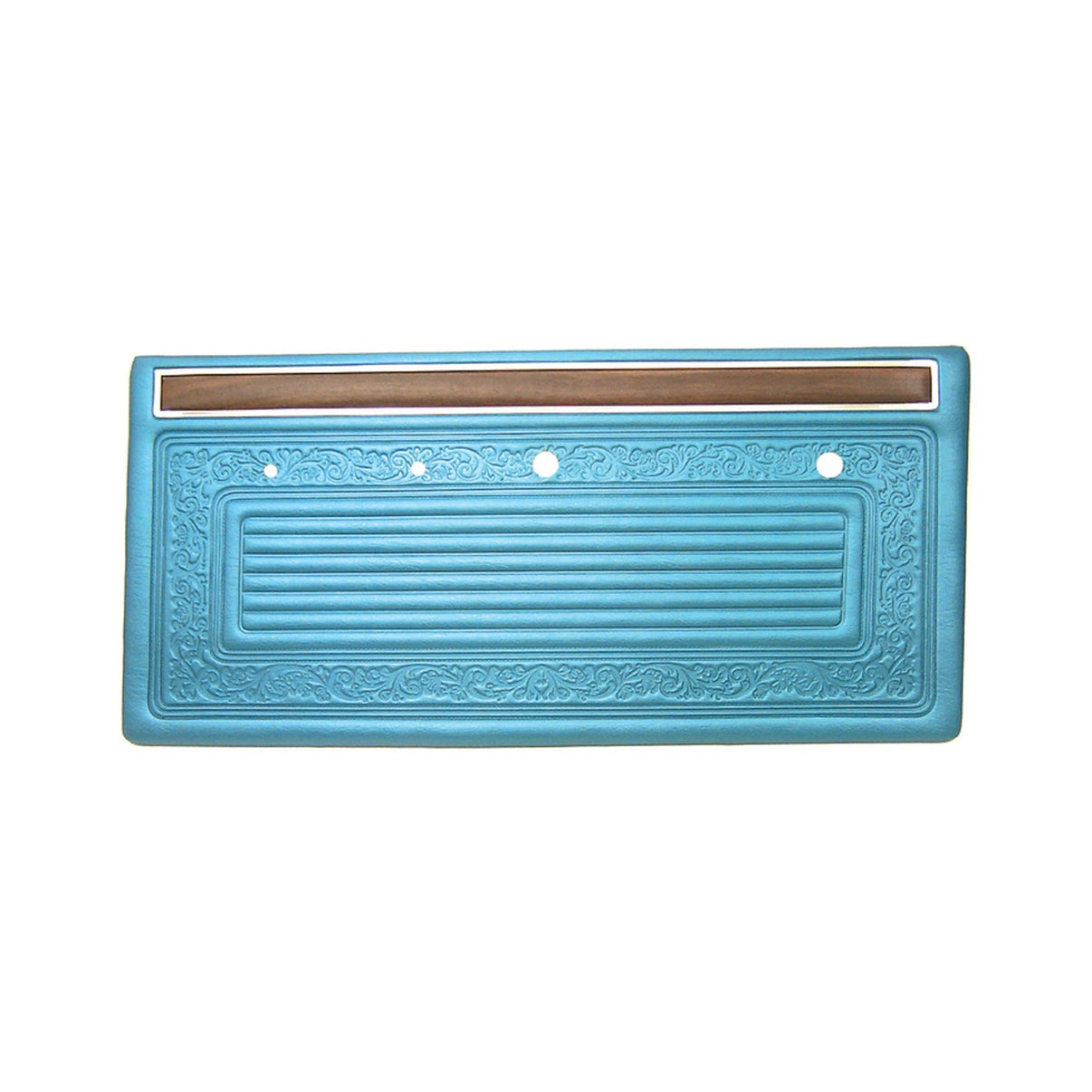 These are reproduced exactly like original. They feature authentic "scroll" detailing surrounding a horizontal pattern and are die-electrically sealed in walrus grain vinyl and accented with wood grain Mylar. These are complete skins wrapped around a hard plastic panel. They are available as skins only for the restorer who would like to re-use the original metal backings. Factory matched colors include: Black, Bright Blue, Green, Aqua, Red, Saddle, and White. Sold in pairs with one for each front door on the truck.