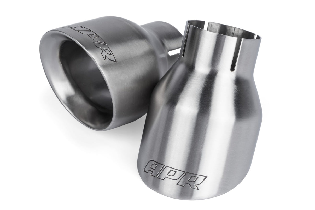 Our brushed slash-cut double-walled 4" exhaust tips upgrade the rear of the vehicle dramatically. The motorsport-inspired tips tuck nicely into the factory valance, gently following the valance's curves, demanding all the right attention in all the right places. Each tip features an engraved APR logo. Each kit is sold as a set of two tips.