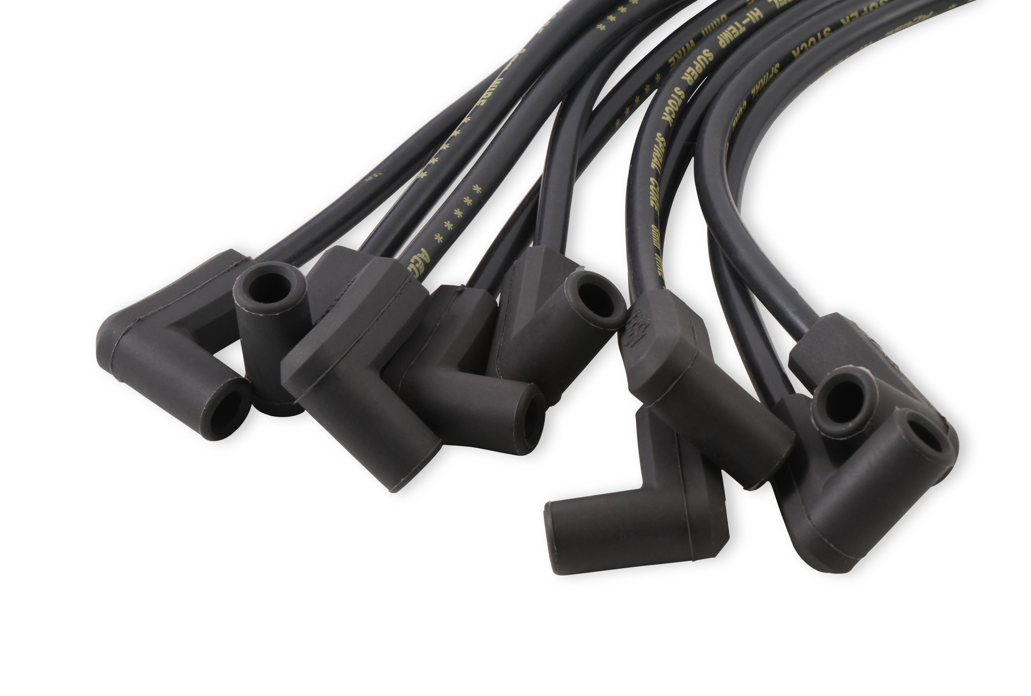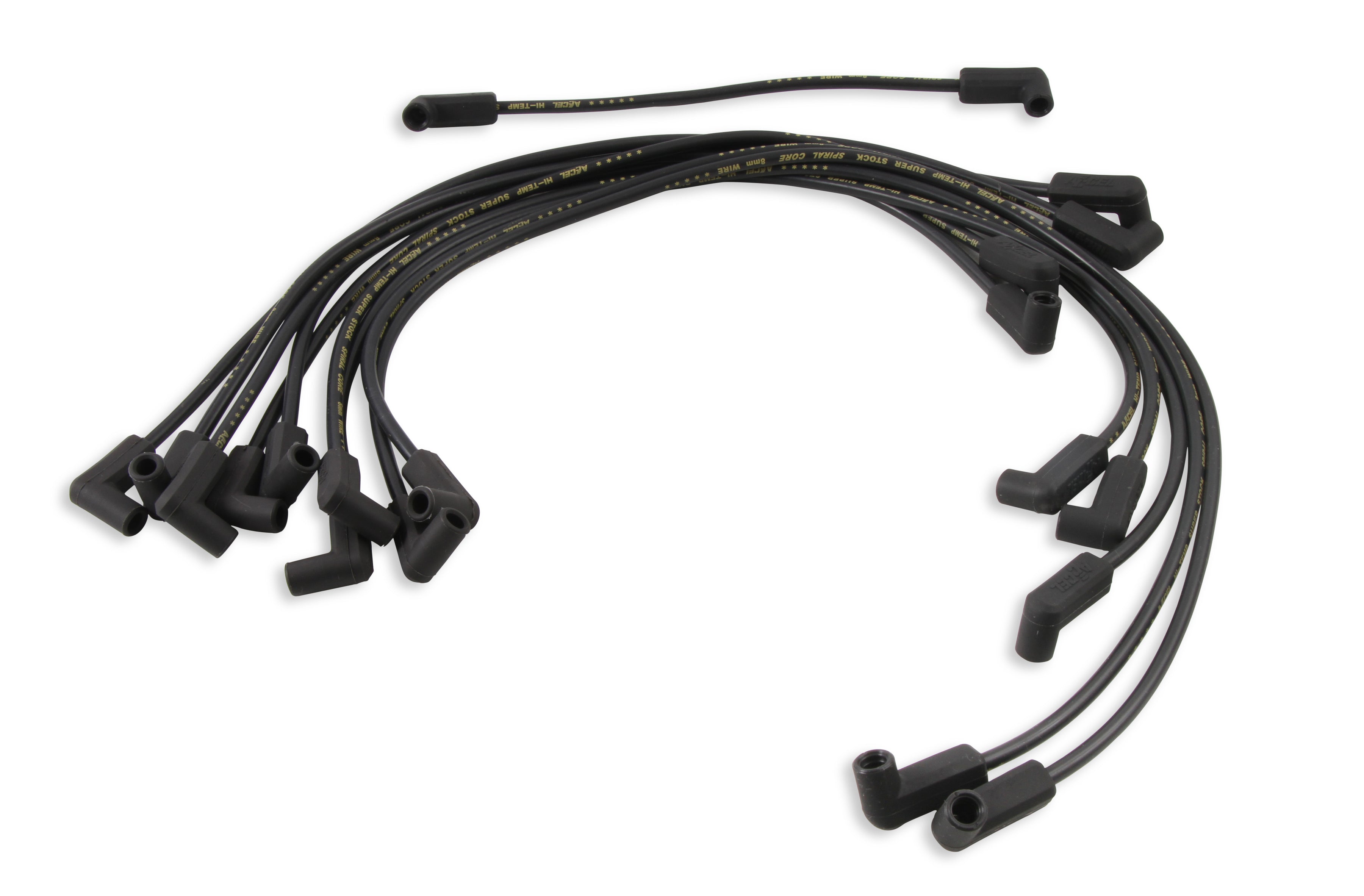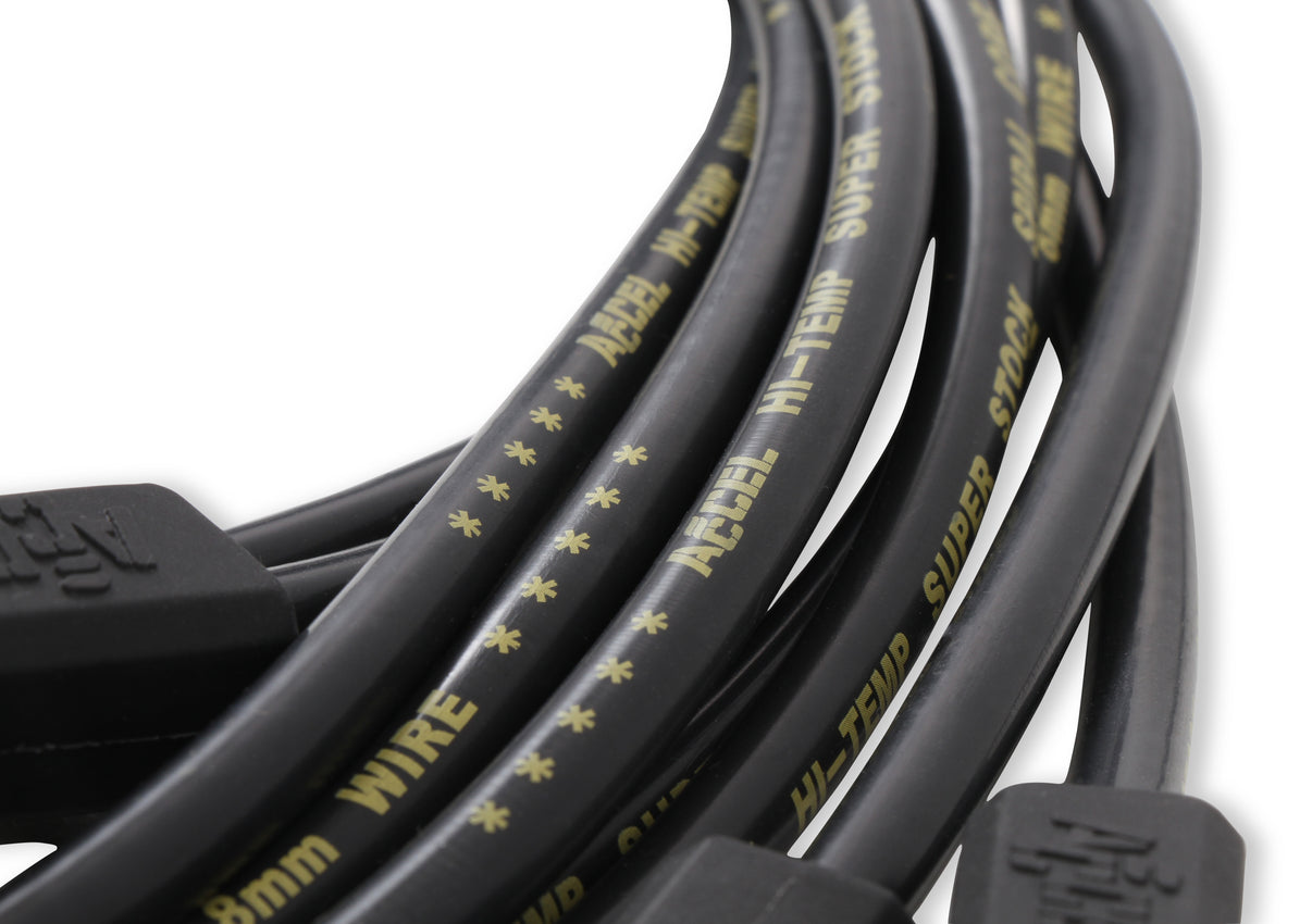 The traditional ACCEL combination of yellow wire and red spark plug boots has been added to these SuperStock Spiral Core 5000 Series wire sets, which feature color-matched wire and spark plug boots in blue, black, and red. With only 500 ohms/ft. of resistance, more ignition energy can reach the spark plug, producing a longer-lasting, hotter spark flame kernel. The results is higher performance through improved efficiency, quicker throttle response, and reduced emissions. This 8mm wire's double silicone construction is rated to 550 degrees F. The high-gloss wire jacket resists moisture, chemicals, and heat extremes for longer life and great looks. The fiberglass braid adds greater pull strength and terminal retention, while the stainless steel spark plug terminals provide excellent long life, electrical conductivity, and corrosion resistance. Both universal and custom-fit applications are available for early and late model cars and trucks.