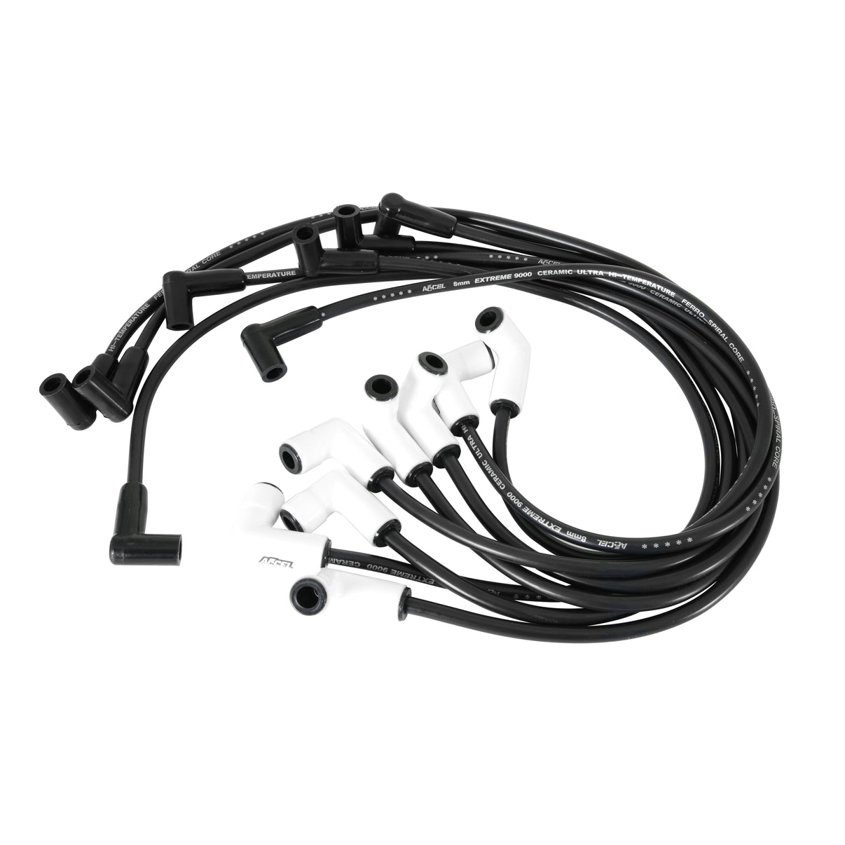 ACCEL now offers the cure for burnt spark plug boots with Extreme 9000 Ceramic wire kits. The 8mm Ferro-Spiral core wire now has ceramic boots on the spark plug end of the wires. Ceramic boots withstand up to 2,000 degrees. Great for running headers with close tolerances, an engine bay with little room, or an RV with boots that melt because of heat. Ultra high temperature double silicone construction wire rated at 600 degrees fahrenheit peak. 500 ohms/ft Ferro-Spiral core developed for performance use. Excellent energy delivery to the spark plugs, while providing the highest level of RFI/EMI suppression. Stainless steel spark plug terminals for maximum spark energy to the plugs. Pre-made to factory lengths for a perfect fit.