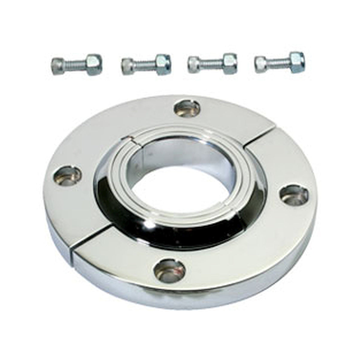 Chrome universal floor mounting plates for custom steering columns. It is a two-piece design with inner sleeves to match custom column diameters.