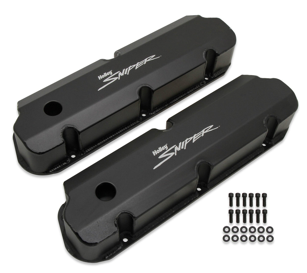Sniper's fabricated aluminum valve covers gives you an excellent way to add a high-end fabricated look without the high-end price. They offer you a lightweight and tough valve cover for your favorite street, off-road, or racing machine. These valve covers are constructed of 6061 T5 sheet aluminum, precision TIG welded for a proper fit, and feature a laser etched "Sniper" logo on top. They are available in silver anodized or black coated finishes along with various heights to clear most popular rocker arm combinations. All of our valve covers include mounting hardware for quick and simple installation.