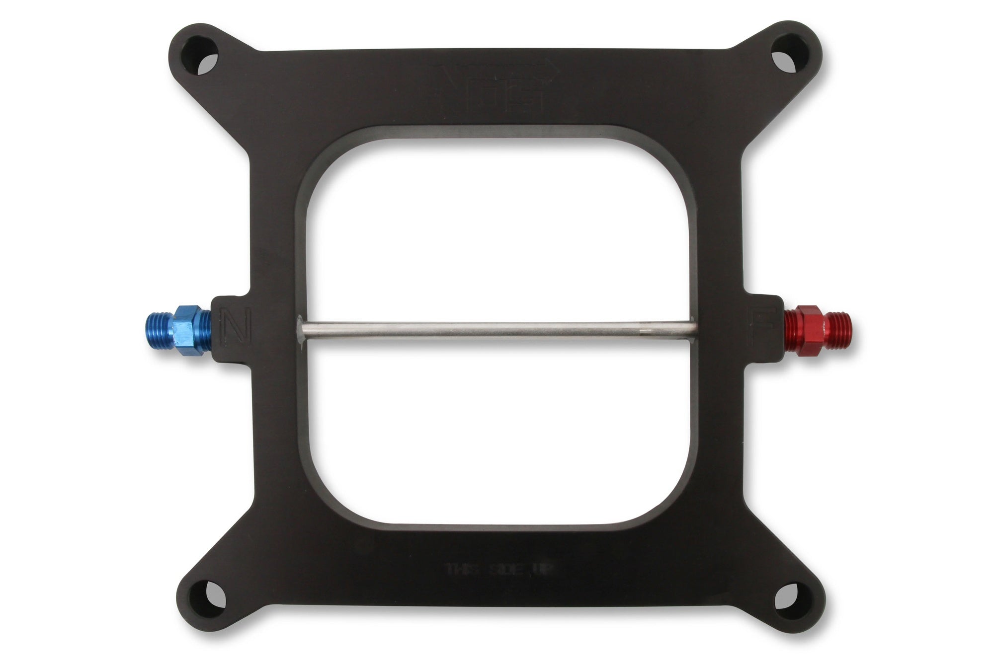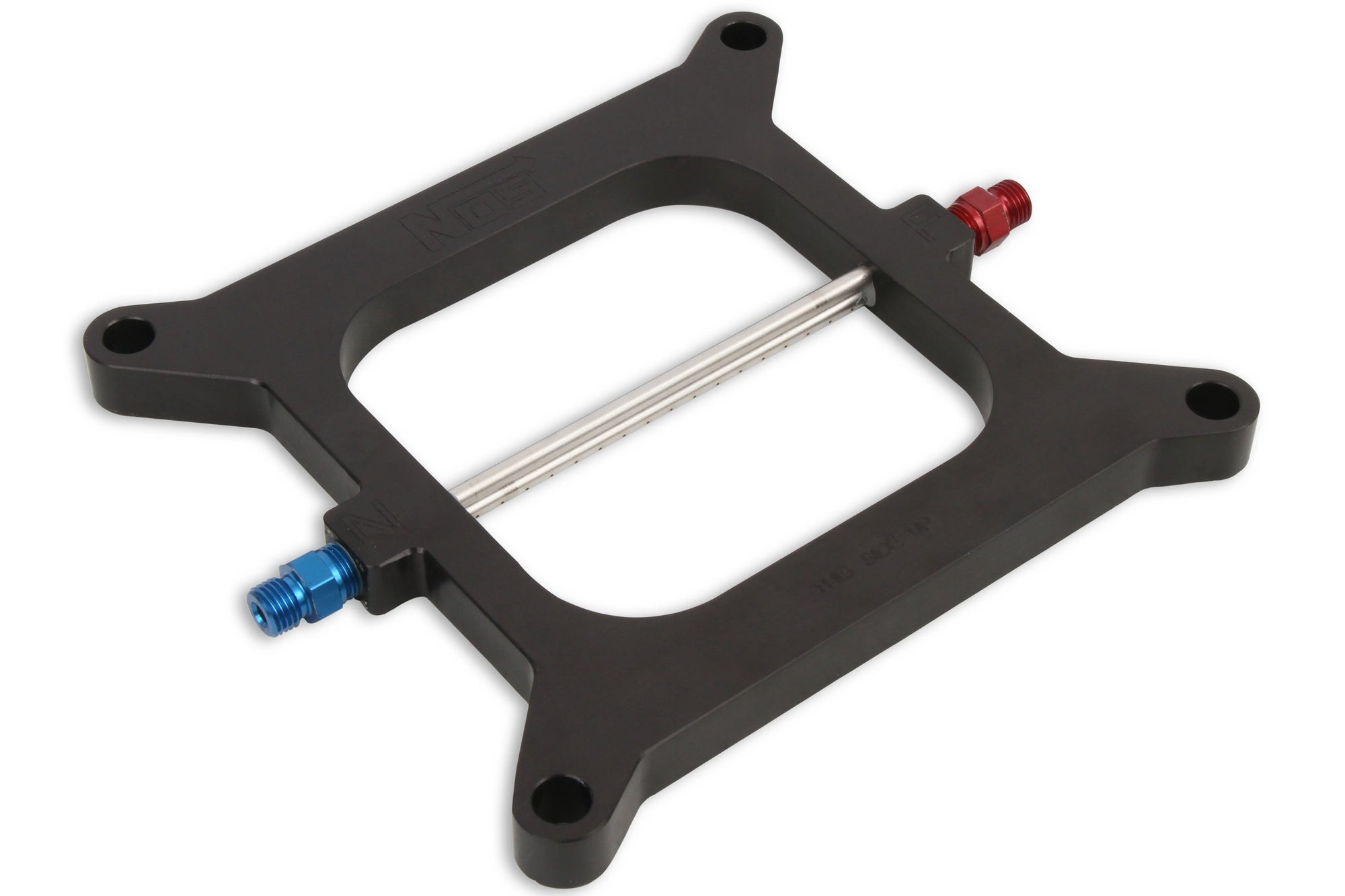 The NOS Big Shot systems use a special "fogging" plate design that vastly improves nitrous flow, fuel atomization and mixture distribution. This Big Shot plate utilizes a unique spray bar that is equipped with tiny orifices. These are precisely located to efficiently dispense a powerful nitrous/gasoline mixture for maximum power gains. Power output is adjustable from 200-300 horsepower simply by changing fuel and nitrous jets.