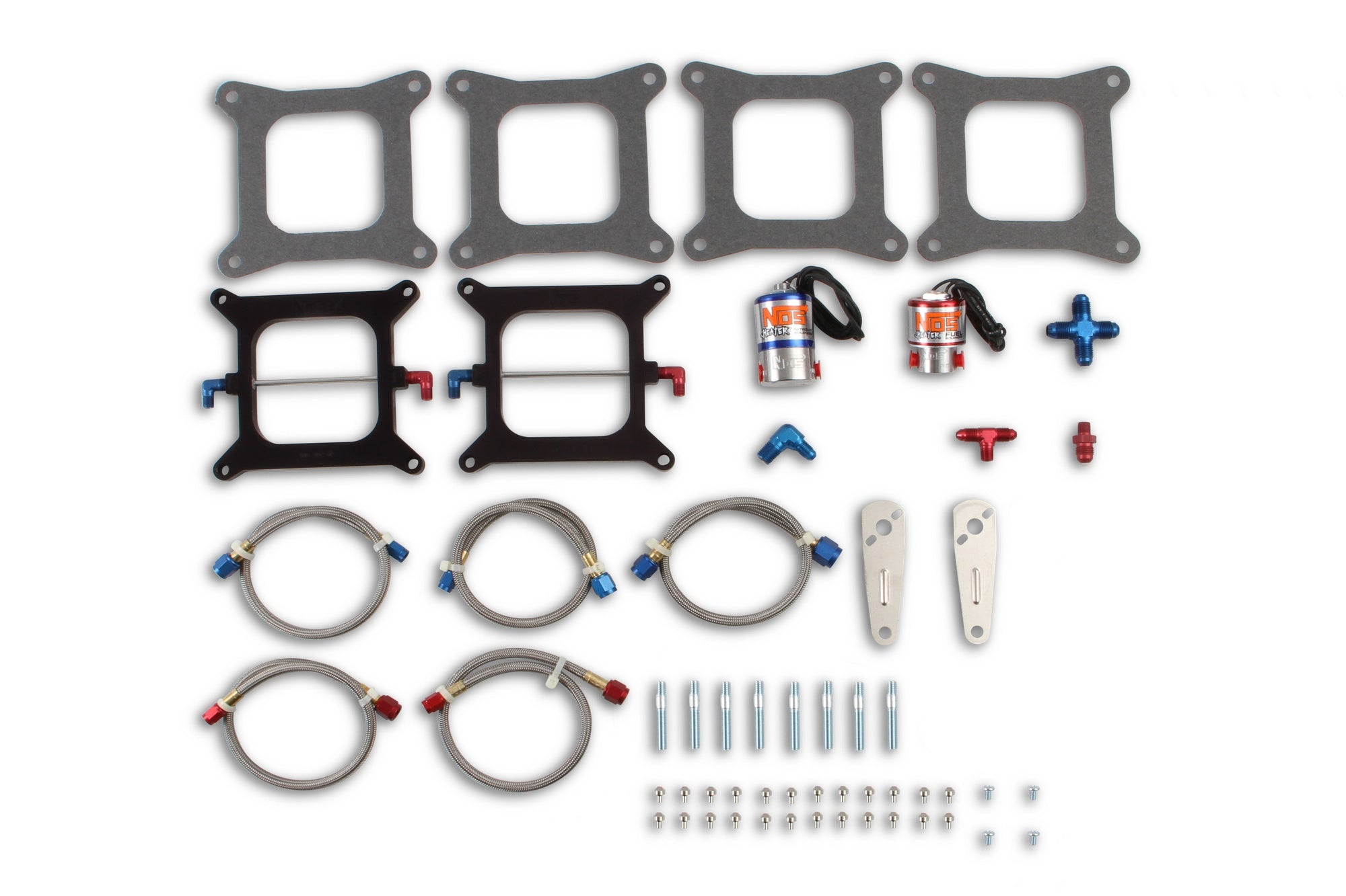 The Pro-Shot Fogger upgrade kits take your Pro-Shot Fogger system and converts it into a two stage Pro-Shot Fogger 2 kit. The dual stage feature allows the user to jet the first stage for traction off of the line, then in the second stage utilizing a Cheater spray bar plate, add maximum mid-range and top-end power. Through testing, NOS has optimized the jetting of the Pro-Shot Fogger 2 upgrade kits for improved power and performance. Available in single four or dual four applications in either a Holley® Square Flange or Holley Dominator® bolt pattern, the Pro-Shot Fogger 2 upgrade kits come complete with NOS new improved Cheater nitrous and fuel solenoids, Cheater spray bar plate(s), jetting and all the necessary hardware to upgrade your Pro-Shot Fogger into a dual stage Pro-Shot Fogger 2 system.