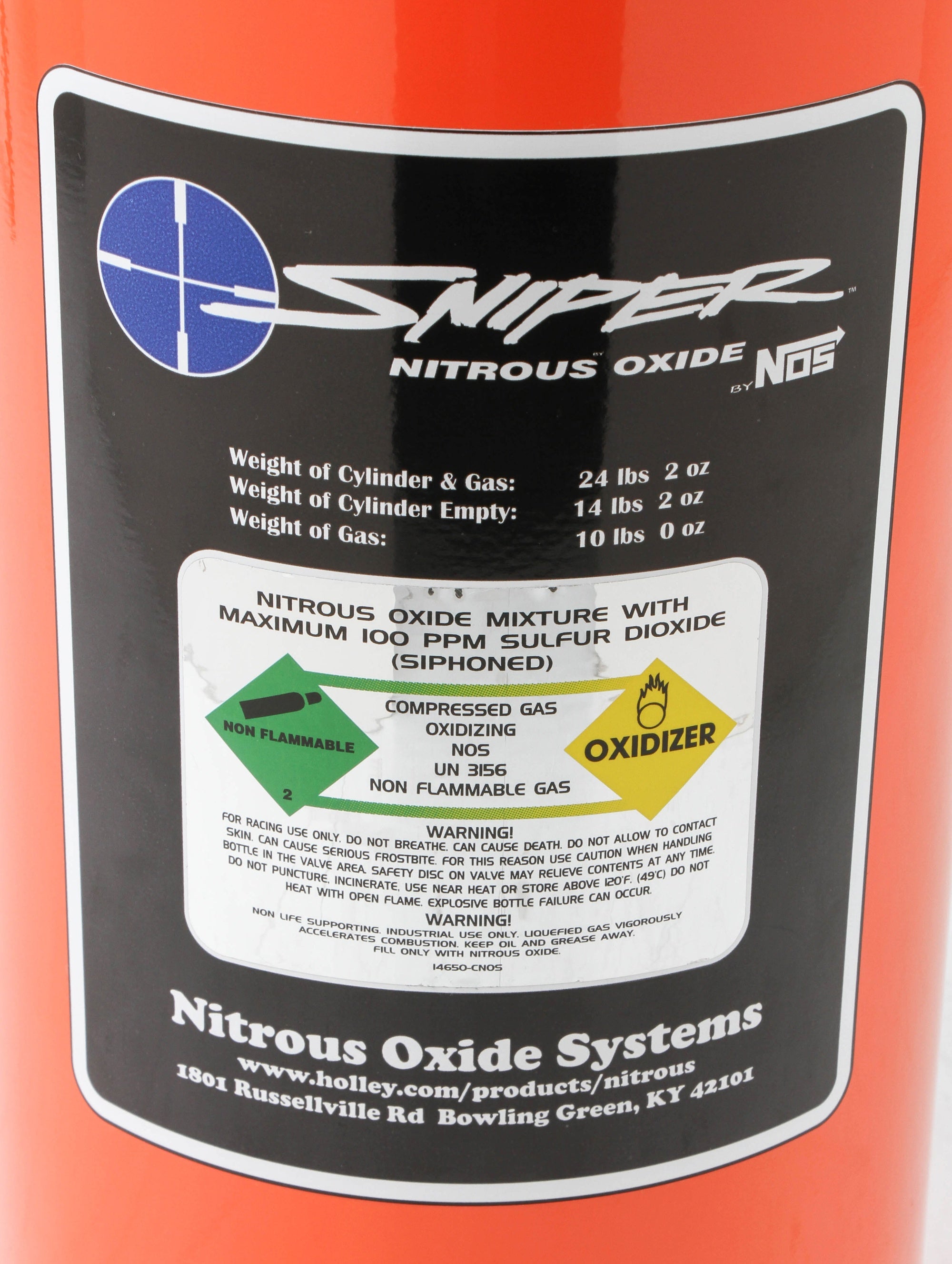 Sniper kits come race ready, right out of the box with all necessary components, including a distinctive bright orange 10 lb bottle with the industry standard industrial valve, adjustable plate with 100-150HP jets, solenoids, plus all required lines, hoses, fittings, clamps and detailed instruction sheet to make installation simple.