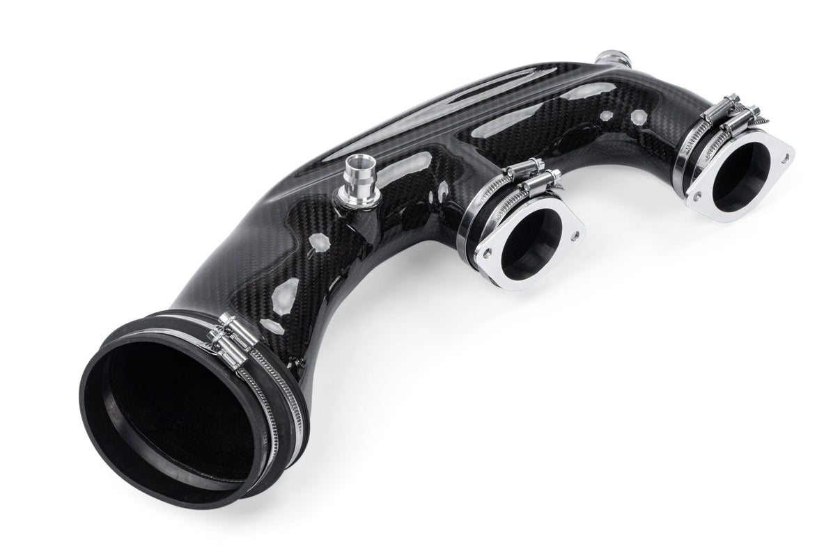 Vores system er en komplet opgradering, da det erstatter alle indsugningskomponenterne fra indsugningsstudsen og hele vejen til turboindtagene. Dette er ekstremt vigtigt, da fokus på luftfilterkassen alene ikke adresserer de største begrænsninger, der findes i det fabriksmonterede indsugningssystem. Kort sagt flyder vores system bedre end originalen, leverer mere kraft, belaster turboladerne mindre, ser sexet ud under motorhjelmen med det smukke kulfiberdesign og forbedrer motorens lyd.