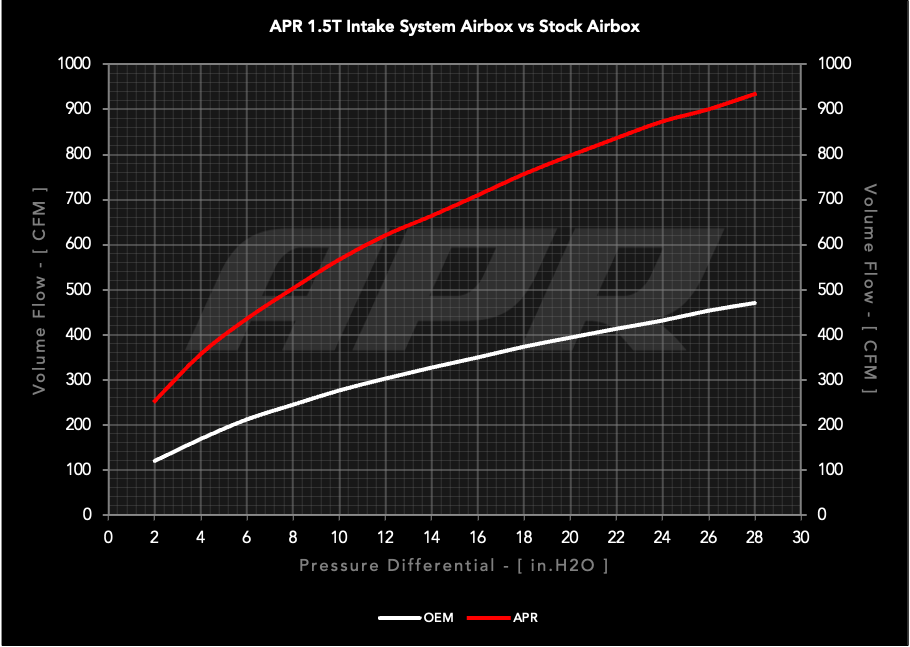 Det fabriksmonterede indsugningssystem kan simpelthen ikke matche ydeevnen af vores eget. Den fabriksmonterede frontale luftkasse yder kun 470 CFM ved 28" H2O. Vi forbedrede dette med op til 113% med vores åbne luftkasse i hele testområdet og nåede et peak flow på 935 CFM ved samme undertryk! Dette betyder direkte mere kraft, du kan mærke. Vores 1,5T testbil oplevede yderligere 10 WFT-LBS drejningsmoment og 6 WHP sammenlignet med standard! Dette er solide forbedringer, der gør en mærkbar forskel i ydeevne!