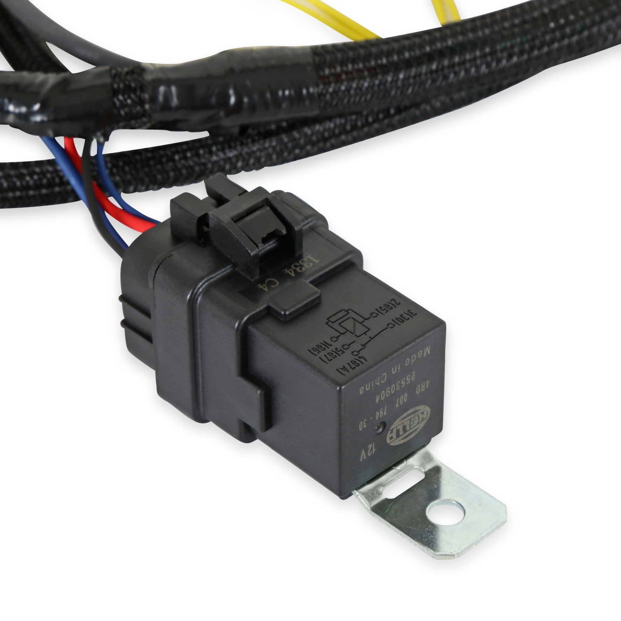 Dette ledningsnet inkluderer en omskiftelig 12V, batteri+ og jord-, brændstofpumperelæ, spoleindgangsledning og HyperSpark-fordelerstik. Ledningsnettet er flettet og split-vævet for at beskytte ledningerne i motorrummet. Dette er beregnet til brug i applikationer, der kræver et brændstofpumperelæ.