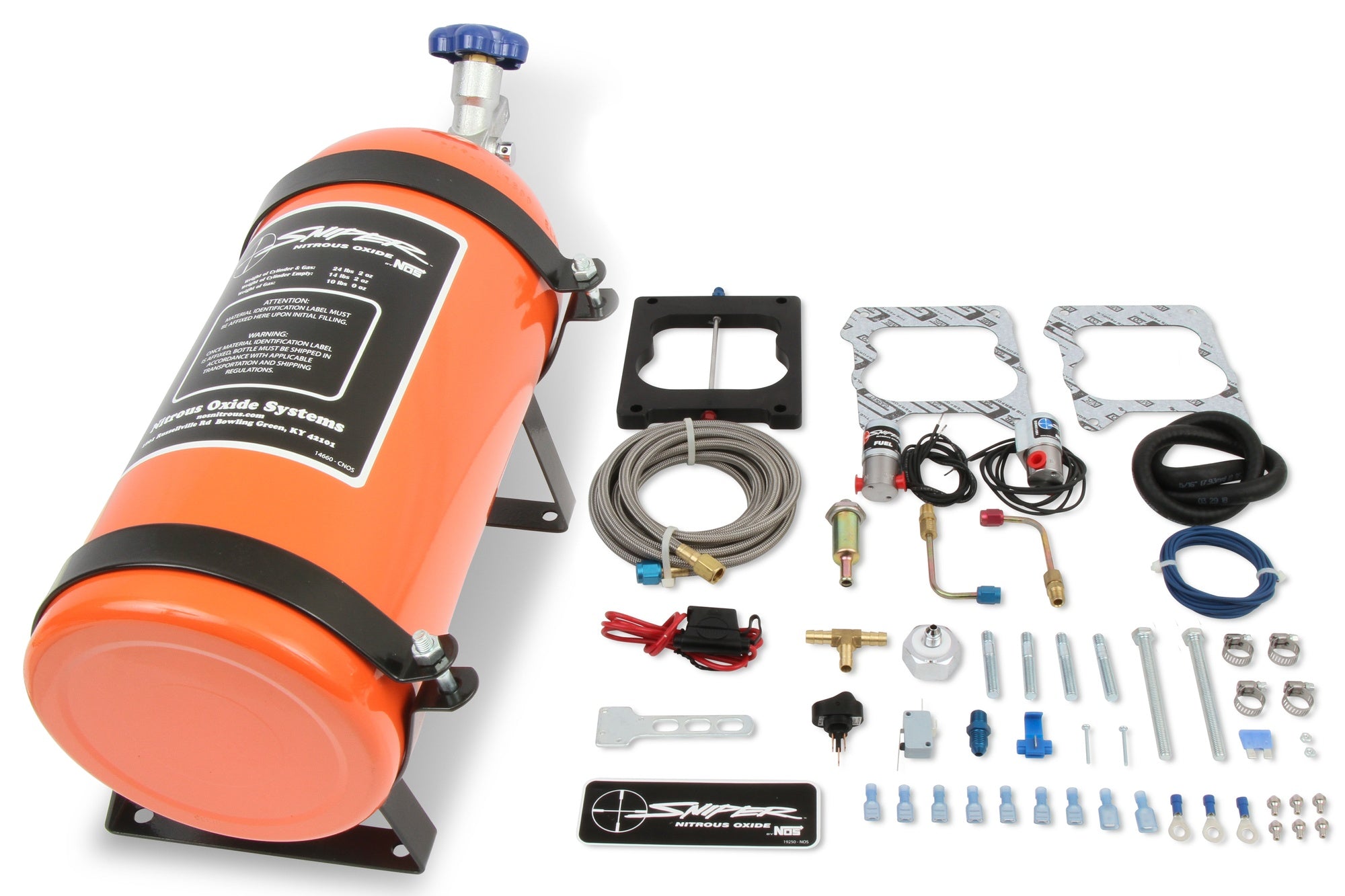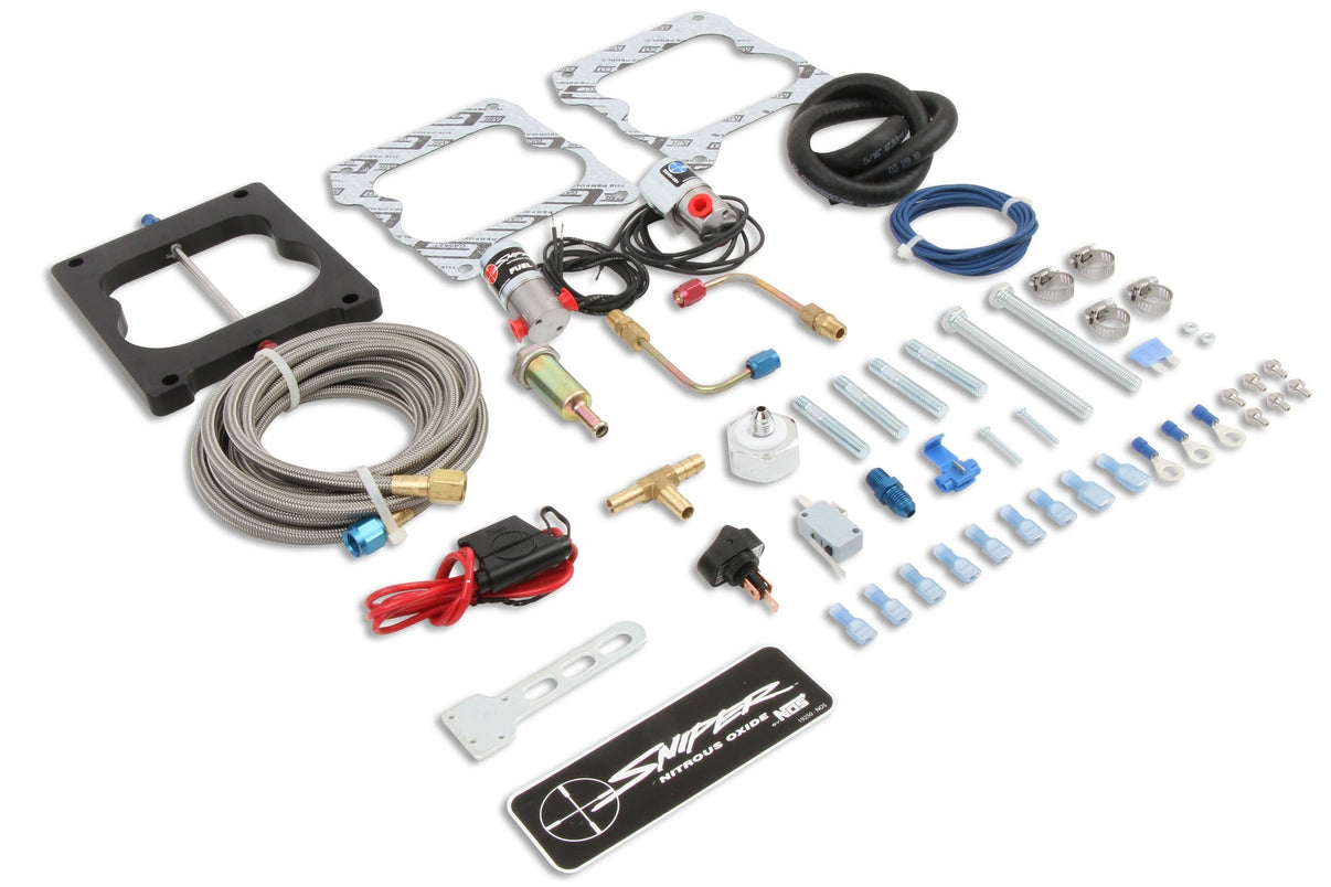 Sniper-sættene leveres klar til løb direkte fra æsken med alle nødvendige komponenter, inklusive en karakteristisk lys orange 10 lb flaske med branchestandard industriventil, justerbar plade med 100-150 hk dyser, solenoider, plus alle nødvendige ledninger, slanger, fittings, klemmer og detaljeret instruktionsark for at gøre installationen enkel.