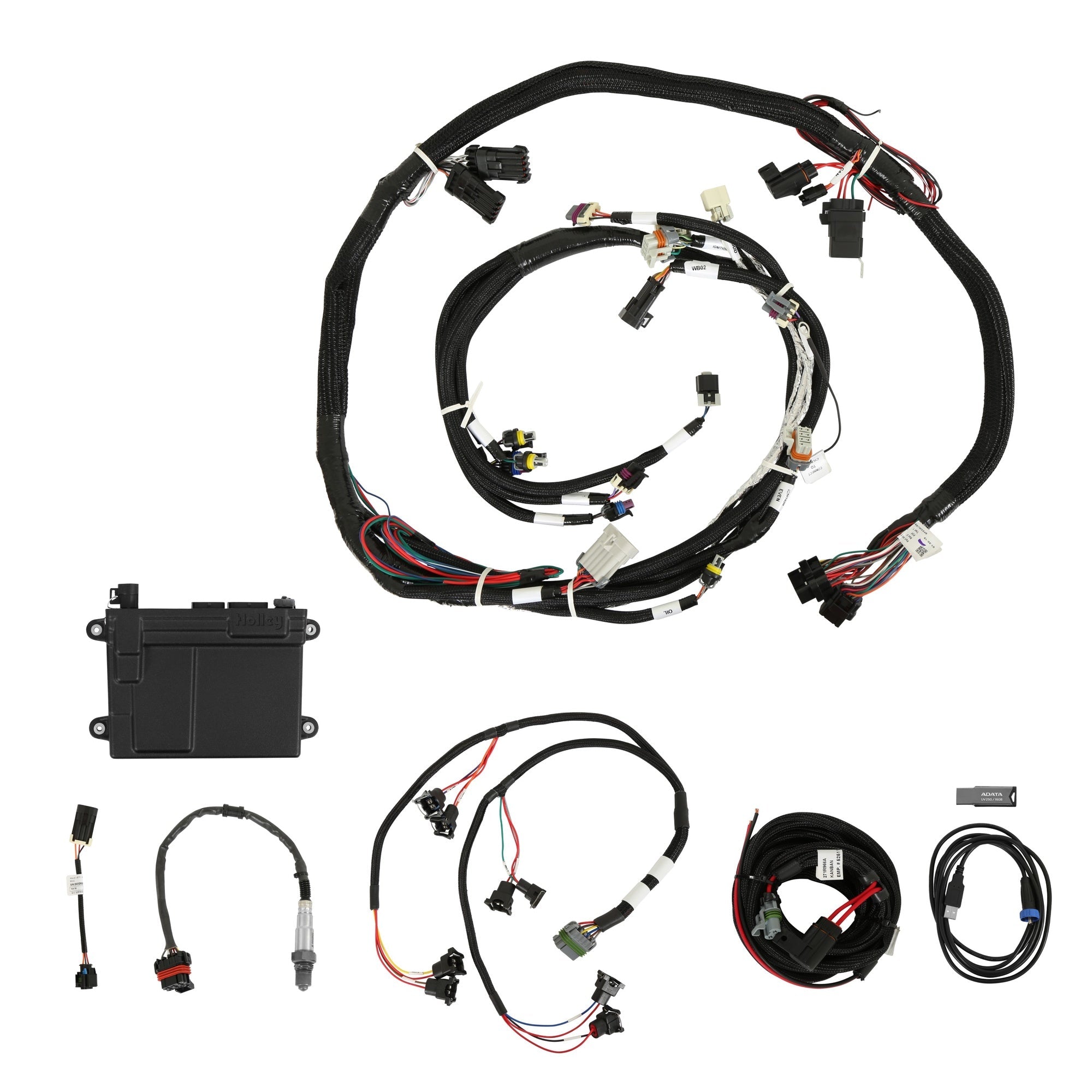 • Ce kit comprend un calculateur, un faisceau de câbles, un câble de communication, un logiciel, des connecteurs d'injecteurs Jetronic/Minitimer (type Bosch) et une sonde lambda à large bande Bosch. Il est conçu pour être utilisé avec les moteurs GM LS2/LS3/LS7 équipés de bobines d'allumage GM d'origine et d'un capteur de vilebrequin à 58 dents.