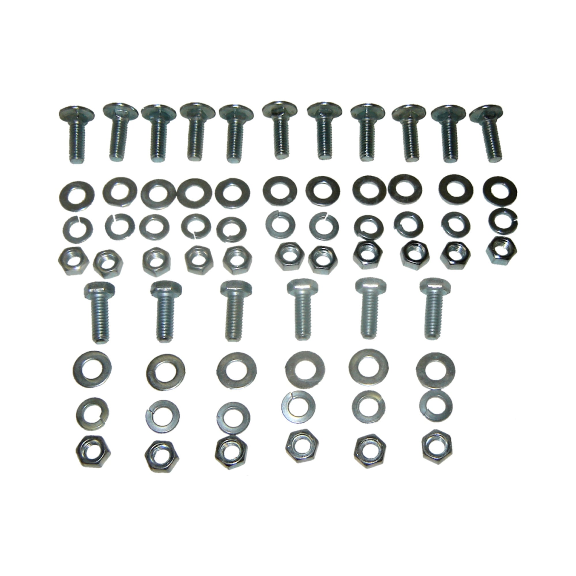 - Comprend : (11) boulons à tête carrée, (4) boulons de carrosserie, (6) boulons à tête hexagonale, (17) rondelles frein, (27) rondelles plates et (27) écrous