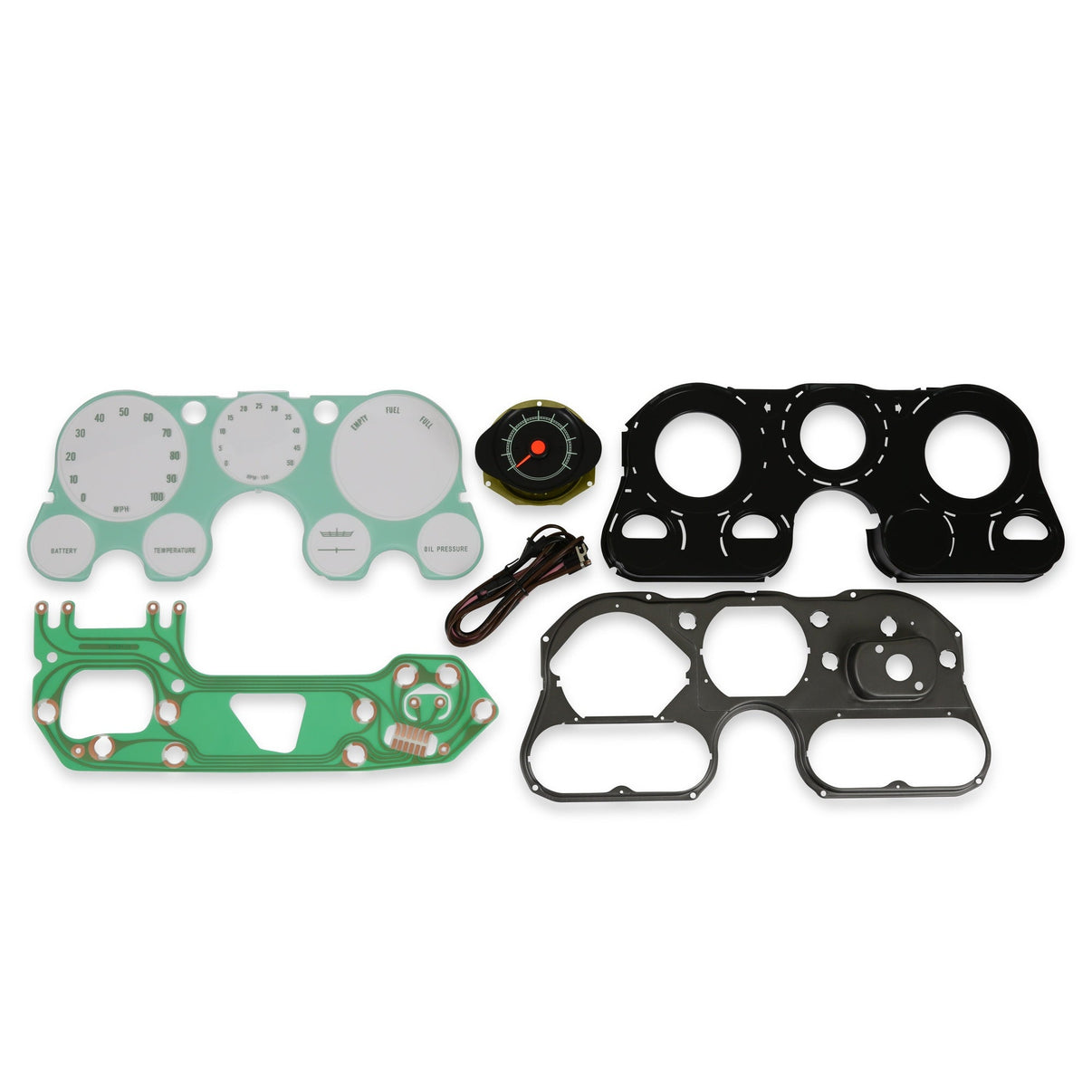 • Le kit comprend : un tachymètre de reproduction, une lentille de tableau de bord, un circuit imprimé, un câblage complet et deux boîtiers métalliques.