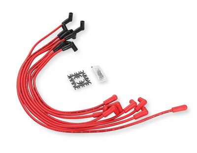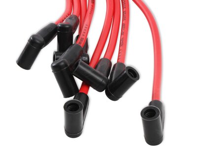 La combinaison traditionnelle ACCEL de fil jaune et de capuchons de bougie rouges a été ajoutée à ces faisceaux de câbles SuperStock Spiral Core série 5000, qui proposent des câbles et des capuchons de bougie assortis en bleu, noir et rouge. Avec une résistance de seulement 500 ohms/pied, davantage d'énergie d'allumage atteint la bougie, produisant une étincelle plus chaude et plus durable. Il en résulte des performances accrues grâce à une efficacité améliorée, une réponse à l'accélérateur plus rapide et des émissions réduites. La construction à double silicone de ce câble de 8 mm est conçue pour résister à des températures allant jusqu'à 288 °C (550 °F). La gaine brillante du câble résiste à l'humidité, aux produits chimiques et aux températures extrêmes, pour une durée de vie prolongée et une esthétique impeccable. La tresse en fibre de verre renforce la résistance à la traction et la tenue des bornes, tandis que les bornes de bougie en acier inoxydable offrent une excellente longévité, une conductivité électrique optimale et une résistance à la corrosion. Des applications universelles et sur mesure sont disponibles pour les voitures et camions, anciens et récents.