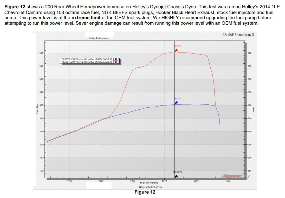 NOS a conçu un système d'injection de protoxyde d'azote complet et de haute qualité, capable d'ajouter jusqu'à 250 chevaux aux roues arrière (RWHP) de la Chevrolet Camaro 2010-2015 équipée du moteur V8 LS3. Ce système utilise une plaque « humide », ce qui signifie que le carburant supplémentaire est injecté par le biais du système d'injection de protoxyde d'azote ; aucun remplacement d'injecteurs ou modification du système d'alimentation n'est donc nécessaire*. La particularité de ce kit réside dans l'inclusion du contrôleur progressif NOS Mini à deux étages. NOS est le seul fabricant à proposer un contrôleur progressif dans un kit à ce prix. Ce contrôleur est essentiel pour assurer une distribution de puissance du protoxyde d'azote fluide avec les systèmes d'injection électronique d'origine.