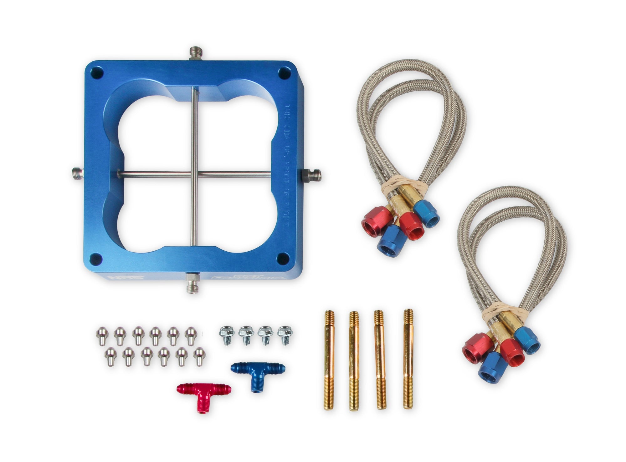 Les kits CrossHair™ comprennent une plaque CrossHair™ anodisée bleue, compatible avec les entraxes de fixation Holley 4150™ ou 4500™ (Dominator®), ainsi que de nouveaux solénoïdes améliorés, des gicleurs, des tuyaux et des accessoires de montage. NOS propose séparément des kits de câblage électrique et des kits de bouteilles de carburant, disponibles en différentes combinaisons pour vous permettre de créer votre propre kit personnalisé.